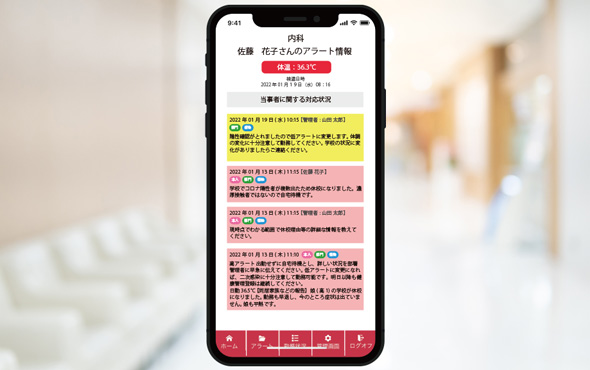 報告される体調情報から自宅待機や勤務継続などの一次対応を自動化。アラート機能により情報の収集・管理が容易になります。